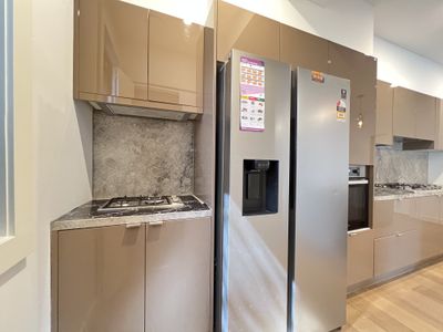 The light-filled open-plan lounge and dining area flows seamlessly to a stylish kitchen featuring premium Miele appliances, ample storage, and the rare bonus of two separate stoves – ideal for versatile cooking.